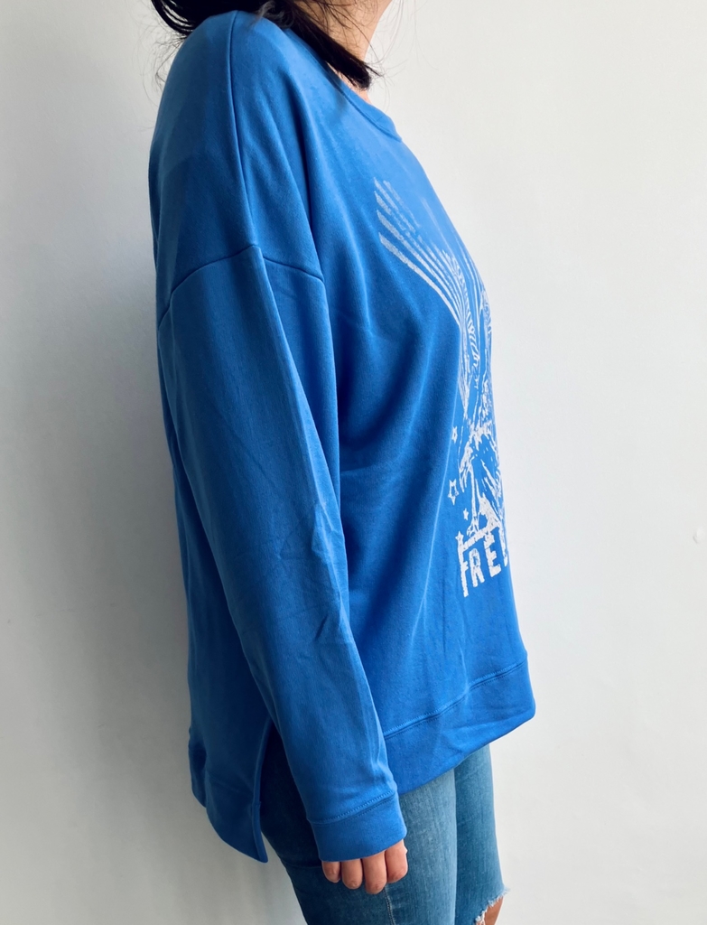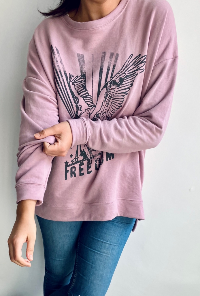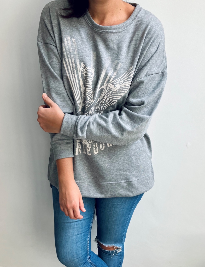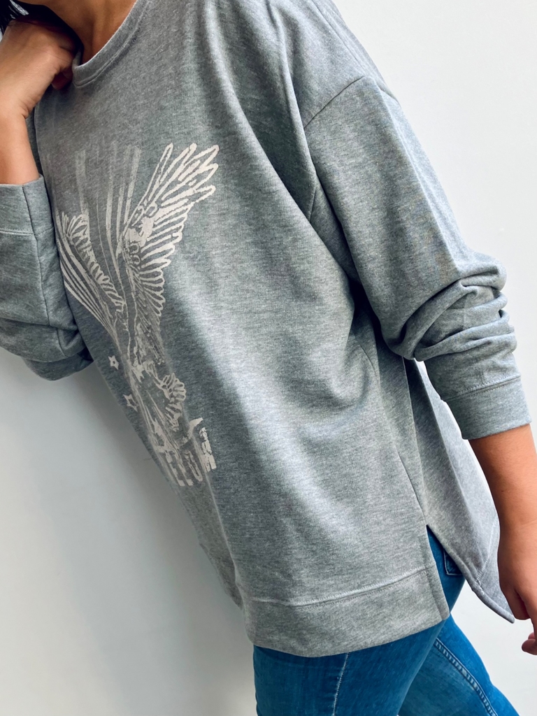 Buzo oversize de algodón rústico con tajos laterales y estampa en el frente. Largo irregular.