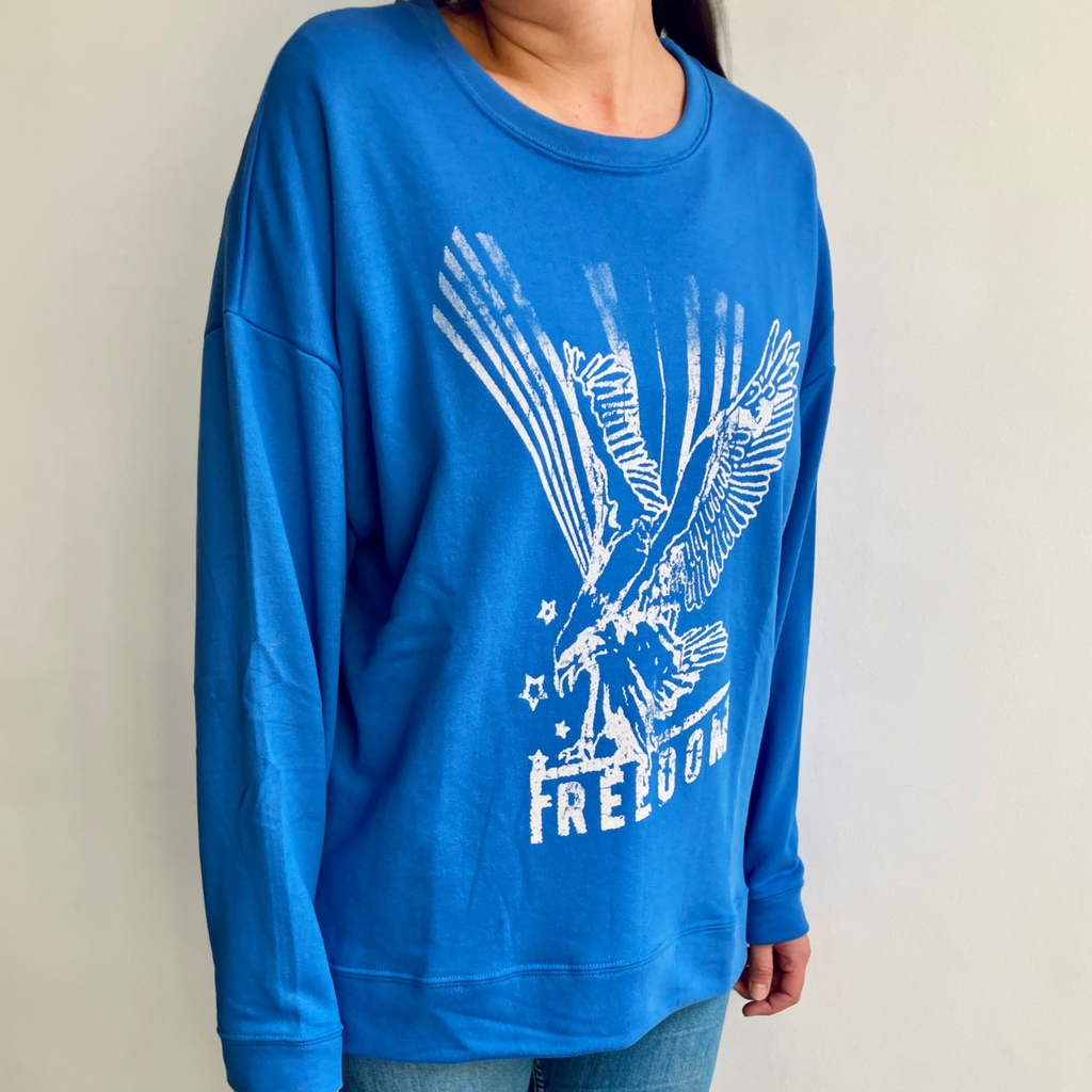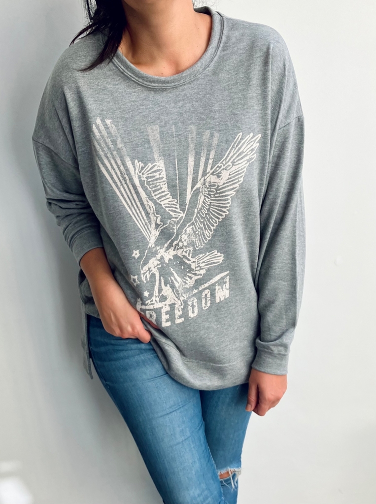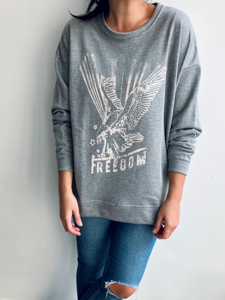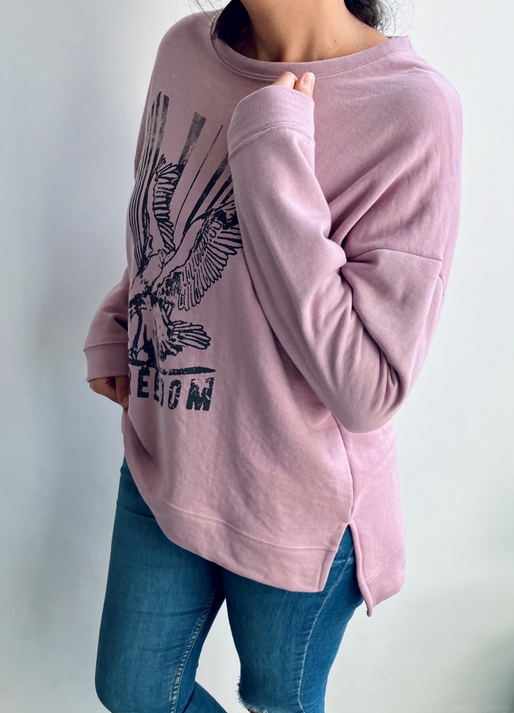Buzo oversize de algodón rústico con tajos laterales y estampa en el frente. Largo irregular.